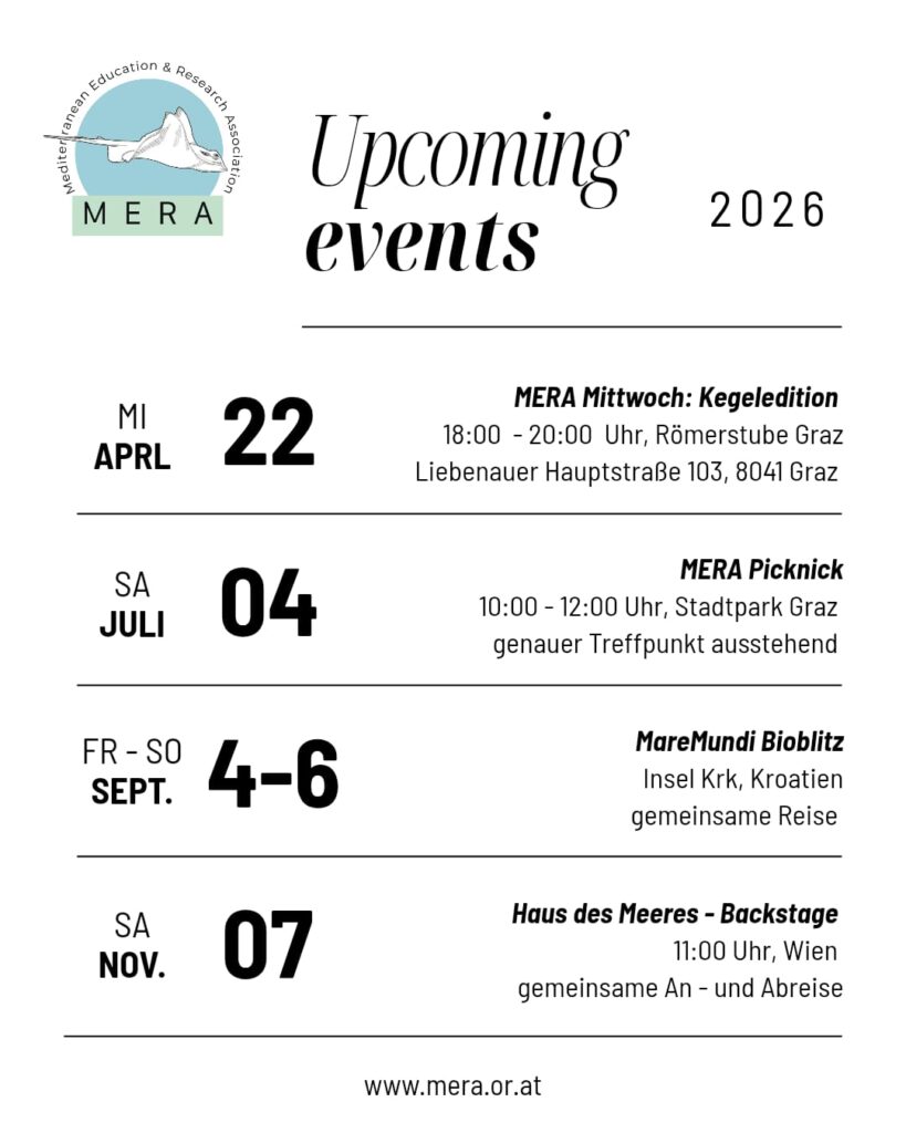 Der Verein MERA fördert Nachwuchsforschung und Naturerlebnisse rund um die mediterrane Biodiversität: Unterstützt werden wissenschaftliche Bachelor- und Masterarbeiten zur Flora und Fauna des Mittelmeerraums ebenso wie Studienexkursionen und Schulausflüge. So verbindet MERA Forschung und Bildung – und stärkt das Verständnis für mediterrane Ökosysteme dort, wo es am meisten wirkt: im Hörsaal und draußen in der Natur.